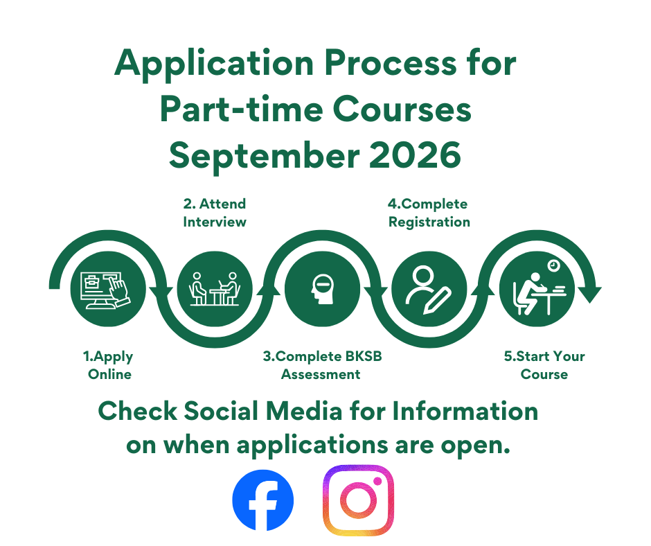 Applicants will be invited to attend an in-person interview. On the same day as the interview, students will be required to complete a BKSB assessment. If successful, applicants will be offered a place, with registration and induction scheduled for September. All courses are set to begin the week of September 10th, 2026.